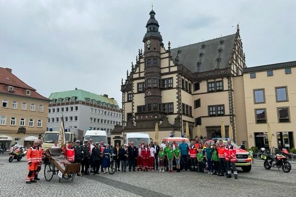 Danach ging es weiter in den Kreisverband Schweinfurt. Auch hier wurden nach Übergabe an den stv. Kreisbereitschaftsleiter Maximilian Sauter mehrere Stationen besucht. Am Marktplatz in Schweinfurt erwartete die Kreisverbandsvorsitzenden Bürgermeisterin aD. Helga Fleischer und weitere Ehrengäste wie der Bezirksbereitschaftsleiter Michael Behringer, der Vorsitzende der Wasserwacht in Unterfranken Thomas Engel und Bezirksgeschäftsführer Harald Erhard die Fackel. Teilweise begleiten diese das "Licht der Hoffnung" auch an weiteren Stationen der Tour.