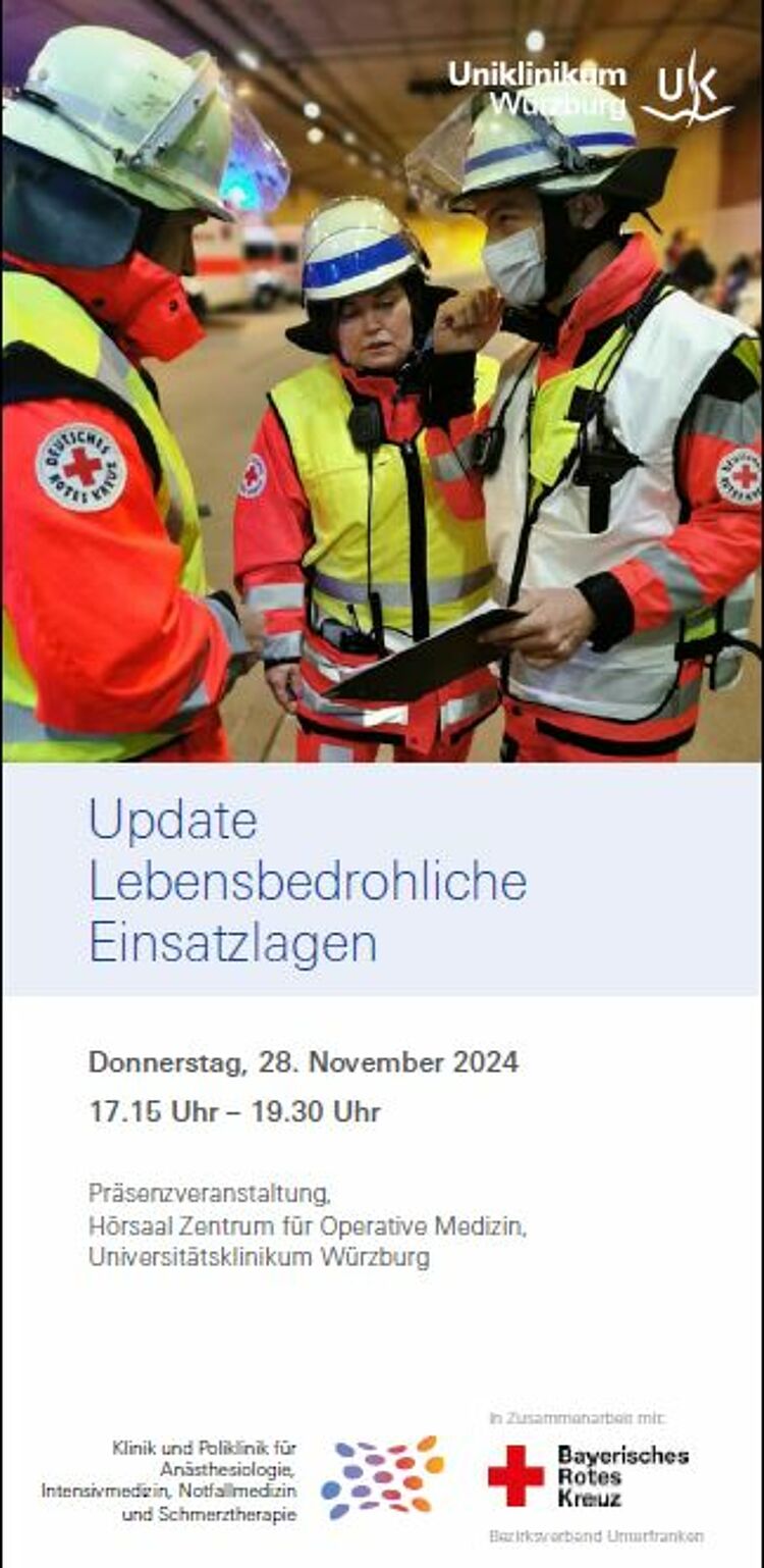 Die Klinik und Poliklinik für Anästhesiologie, Intensivmedizin, Notfallmedizin und Schmerztherapie veranstaltet gemeinsam mit dem Bayerischen Roten Kreuz, Bezirksverband Unterfranken, für alle notfall- und katastrophenmedizinisch Interessierten aus Präklinik und Klinik die nächste Fortbildungsveranstaltung.